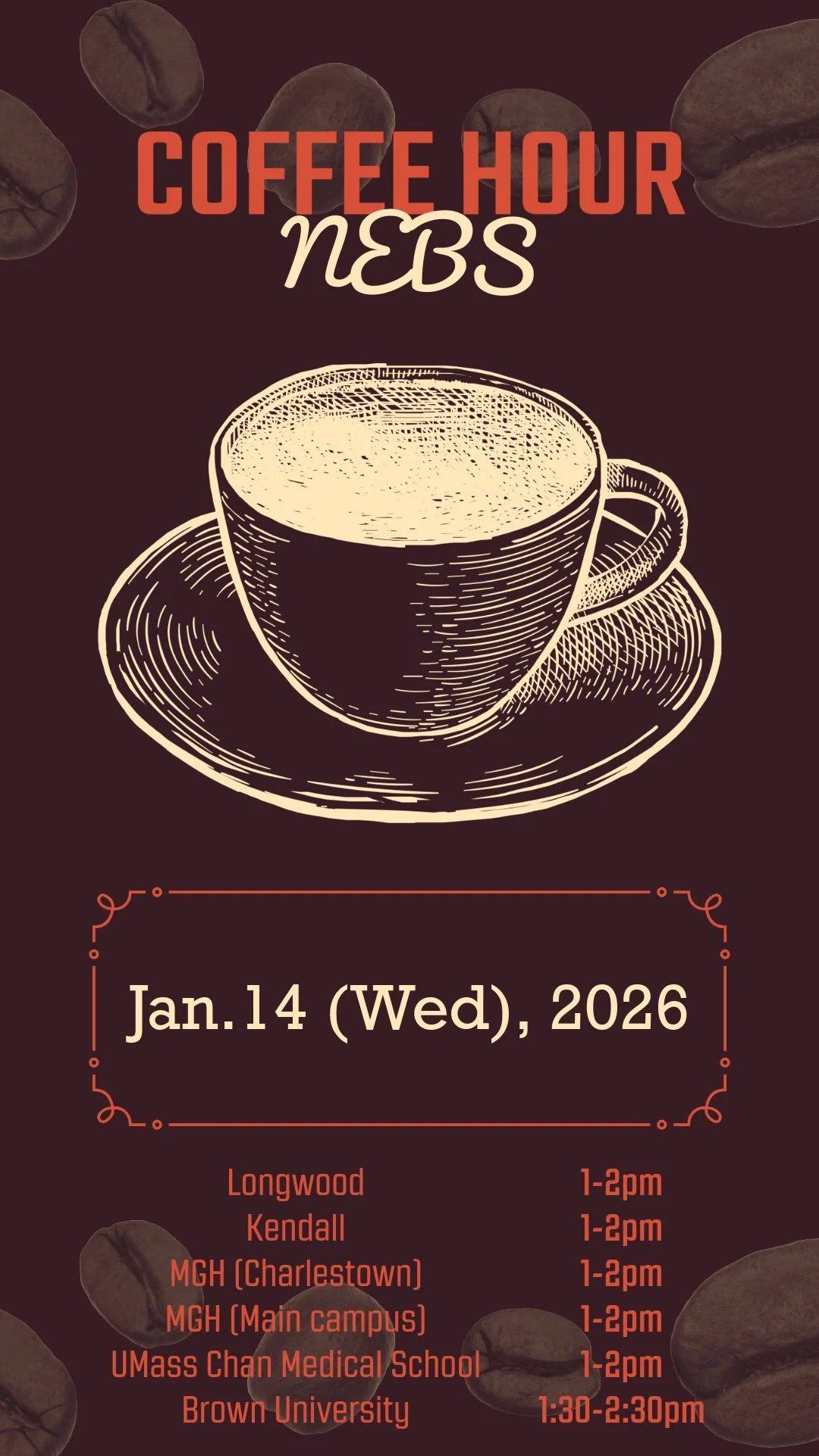 1월 NEBS Coffee Hour 이벤트는 Longwood, Kendall, MGH in Charlestown, MGH in Main campus, UMass Chan Medical School in Worcester, Brown University 에서 각각 동시에 진행되며, 커피와 간식이 제공됩니다.